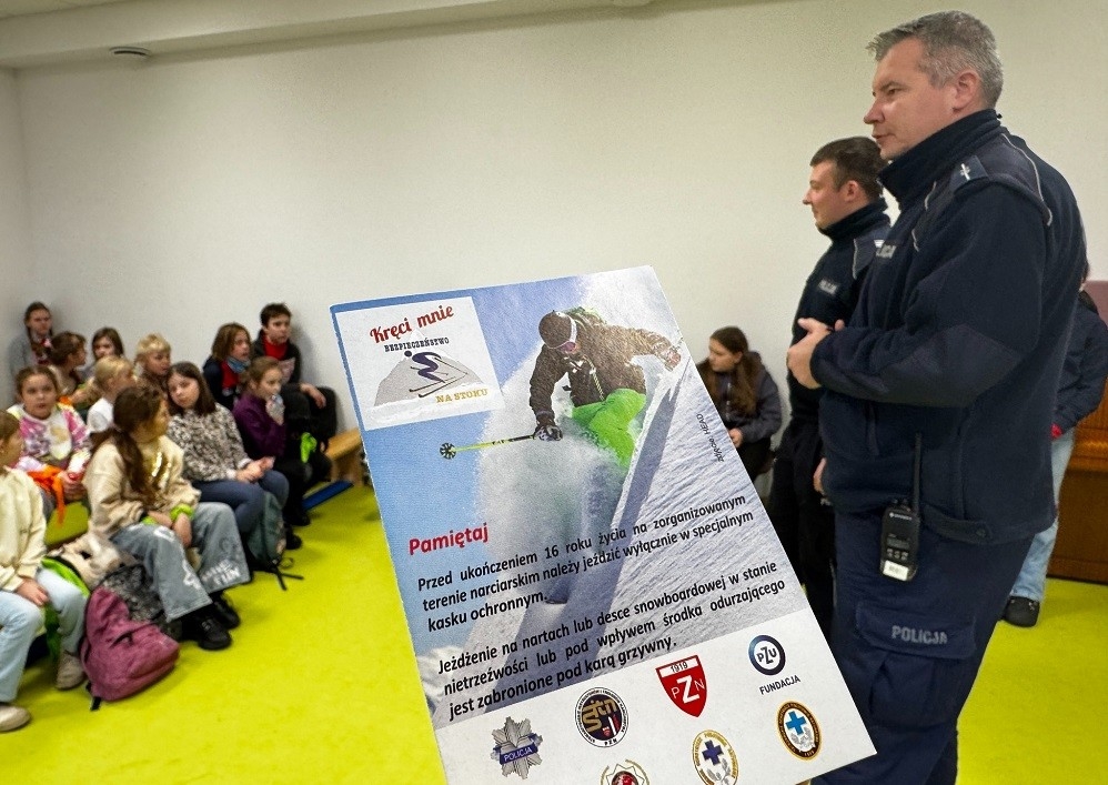 Podczas spotkania policjanci zachęcali dzieci do udziału w trwającym konkursie #ŚnieżnyDekalog, który promuje odpowiedzialne zachowanie podczas zimowych aktywności.