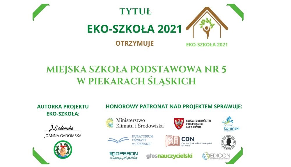 21 czerwca 2021 r. przyznano „Certyfikat Eko-Szkoły 2021” dla Miejskiej Szkoły Podstawowej nr 5 oraz tytuł „Promotora Ekologii 2021” pani Joannie Więckowskiej oraz pani Annie Buchenfeld.