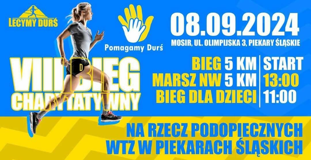 Stowarzyszenie “Lecymy Durś” zaprasza na VIII Bieg Charytatywny “Pomagamy Durś” na rzecz podopiecznych Warsztatów Terapii Zajęciowych w Piekarach Śląskich, który odbędzie się na stadionie Miejskiego Ośrodka Sportu i Rekreacji 8 września 2024 r. o godz. 13:00. Wcześniej, o godz. 11:00, rozpoczną się biegi dla dzieci. Celem wydarzenia jest promocja zdrowego stylu życia, naszego miasta, a także pomoc oraz integracja z osobami z niepełnosprawnościami, potrzebującymi wsparcia. Elektroniczne zapisy na imprezę trwają do 5 września 2024 r. do godz. 23:59.