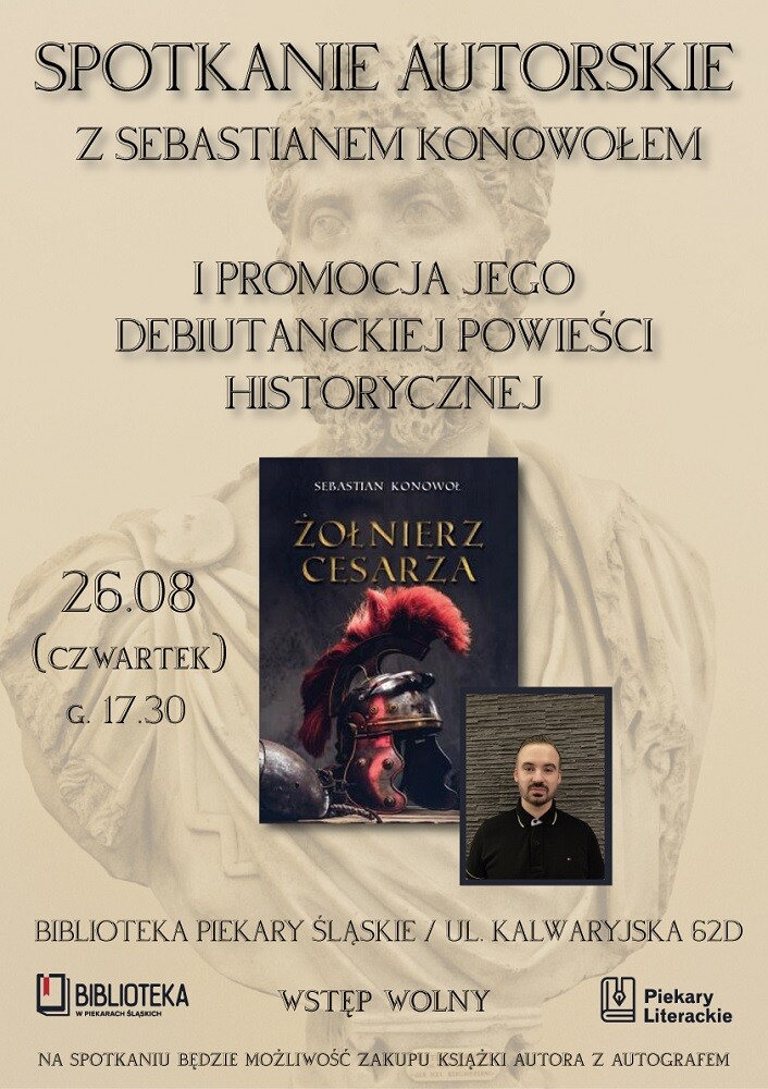Na piekarskiej mapie literackiej pojawił się nowy autor związany z tym miastem, dlatego Miejska Biblioteka Publiczna im. Teodora Heneczeka w Piekarach Śląskich z ogromną przyjemnością zaprasza na spotkanie promujące debiutancką książkę Sebastiana Konowoła pt. "Żołnierz cesarza". Jest to powieść historyczna osadzona w starożytnym Rzymie w okresie panowania cesarza Septymiusza Sewera i jego następców - synów: Karakalli i Gety.