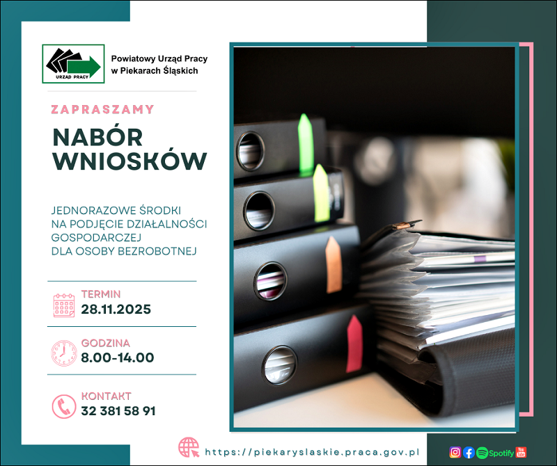 Powiatowy Urząd Pracy w Piekarach Śląskich ogłasza IV nabór wniosków na jednorazowe środki na podjęcie działalności gospodarczej przez osoby bezrobotne. Dokumenty można składać 28 listopada w godzinach 8:00–14:00 w siedzibie urzędu. Wnioski należy złożyć osobiście, wraz z kompletem wymaganych załączników.