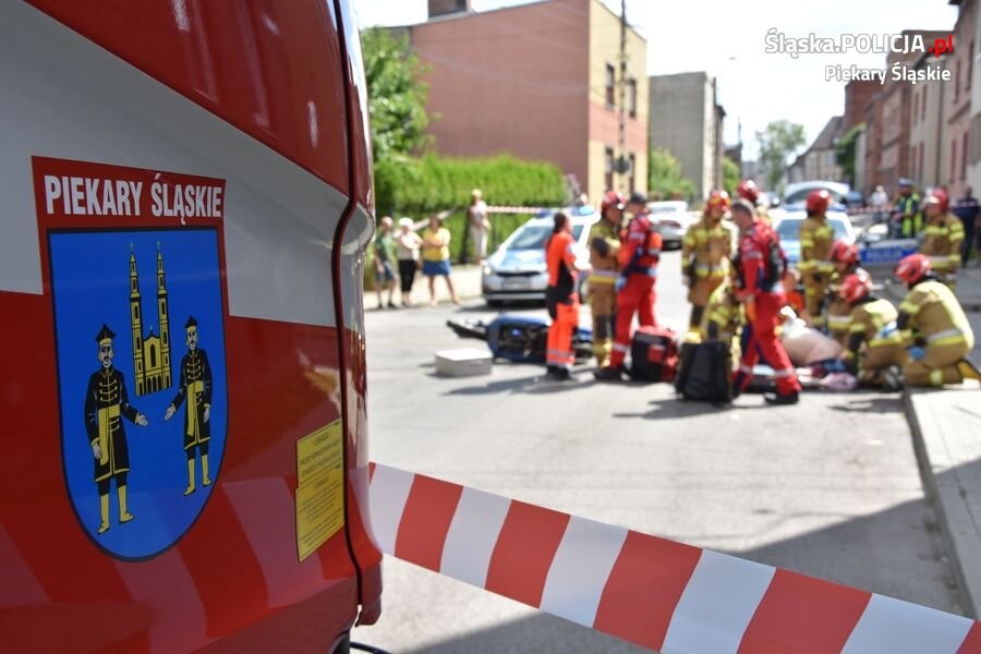 Policjanci wydziału ruchu drogowego piekarskiej jednostki około godziny 10:30 otrzymali zgłoszenie o wypadku drogowym z udziałem motorowerzysty, do którego doszło na skrzyżowaniu ulicy Długosza z ulicą Makuszyńskiego. Mundurowi ustalili, że kierujący jednośladem 57-latek jadąc ul. Makuszyńskiego uderzył w bok volkswagena, który znajdował się na drodze z pierwszeństwem. Stróże prawa ustalili, że uczestnicy zdarzenia byli trzeźwi. Obecna na miejscu załoga pogotowia zabrała poszkodowanego do szpitala w związku z doznanymi obrażeniami. Na miejscu lądował również śmigłowiec Lotniczego Pogotowia Ratunkowego. Dokładne okoliczności zdarzenia będą wyjaśniać teraz piekarscy śledczy.