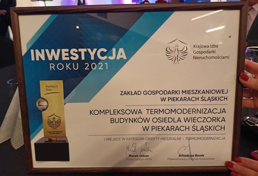 "Kompleksowa termomodernizacja budynków osiedla Wieczorka w Piekarach Śląskich" została zwycięzcą w Konkursie na Inwestycję Roku organizowanym przez Krajową Izbę Gospodarki Nieruchomościami.