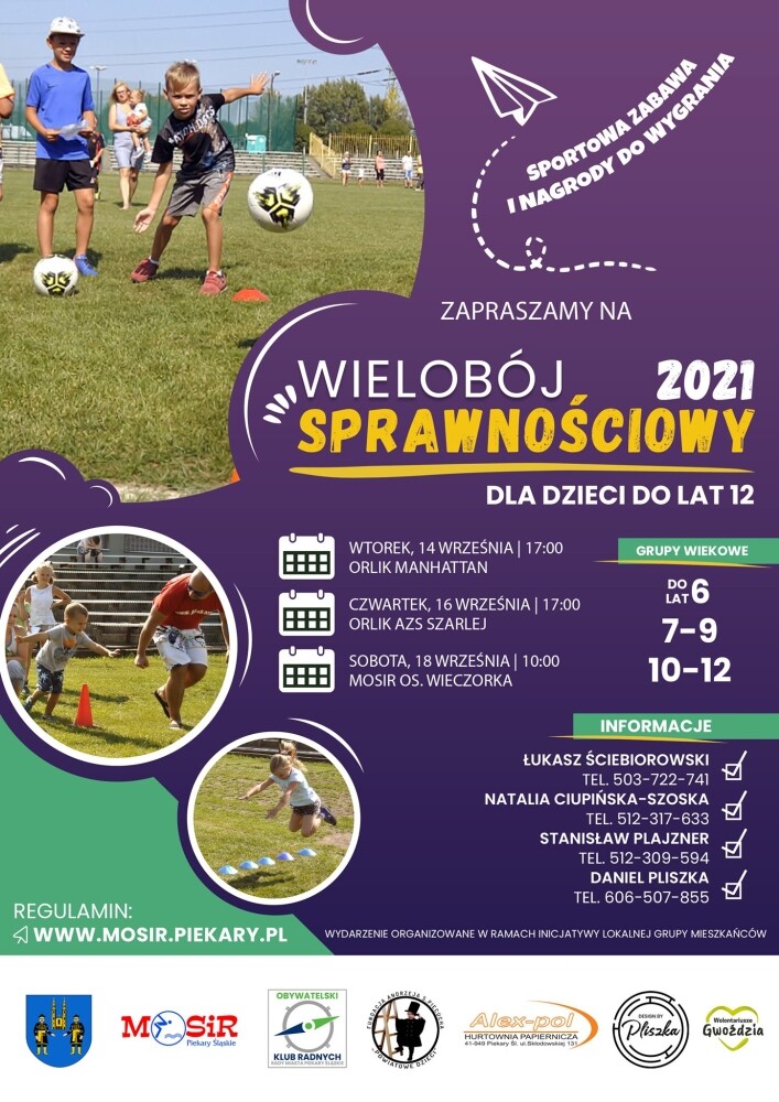 Jak co roku wieloboje odbędą się w trzech dzielnicach naszego miasta, zaczynamy we wtorek 14 września o godz. 17.00 na Orliku – Manhattan, następnie spotkamy się w czwartek 16 września o godz. 17.00 na Orliku w Szarleju, a zakończymy nasze wieloboje w sobotę 18 września o godz. 10.00 na stadionie MOSIR przy ul. Olimpijskiej 3.
