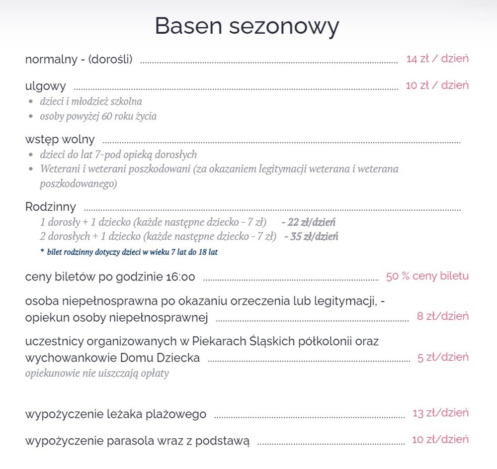 - uczestnicy organizowanych w Piekarach Śląskich półkolonii oraz wychowankowie Domu Dziecka – 5 zł/dzień – opiekunowie nie uiszczają opłaty