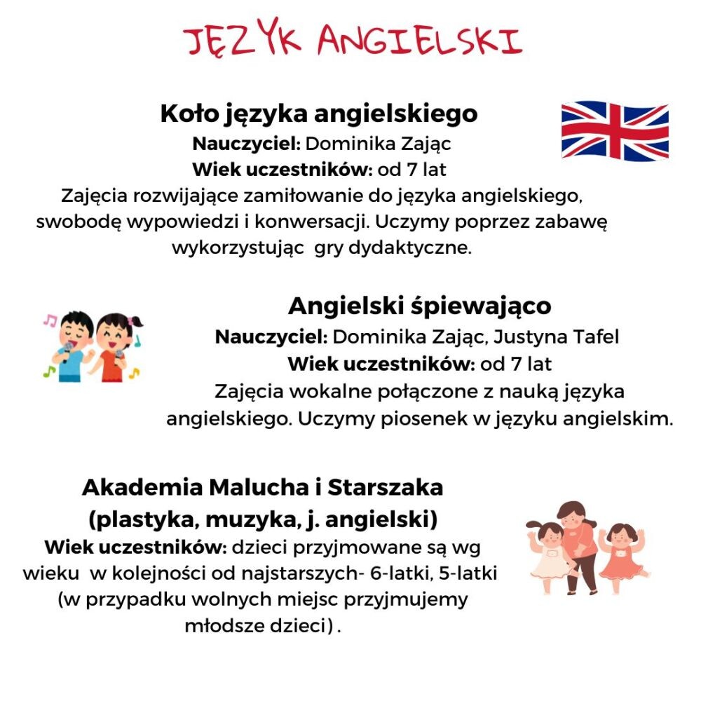 - Koło Języka Angielskiego — Nauczycielką będzie Dominika Zając, dla dzieci w wieku od lat 7. Zajęcia rozwijające zamiłowanie do języka angielskiego, swobodę wypowiedzi i konwersacji. Dzieci będą uczyć się poprzez zabawę, wykorzystując gry dydaktyczne. Liczba miejsc jest ograniczona, 14 miejsc wolnych.
