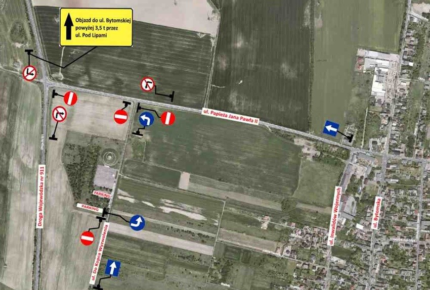 W dniu 12 sierpnia na sąsiadującym z Kopcem odcinku ul. Jana Pawła II (od skrzyżowania z ul. Inwalidów Wojennych do Drogi Wojewódzkiej nr 911) wprowadzona zostanie tymczasowa zmiana organizacji ruchu. Na wymienionym odcinku, od ul. Inwalidów Wojennych do DW 911, wprowadzony zostanie ruch jednokierunkowy z kierunkiem jazdy od ul. Bytomskiej do DW 911. Dojazd do ulicy Bytomskiej od strony DW 911 zostanie zapewniony poprzez wyznaczony objazd ulicą Pod Lipami.