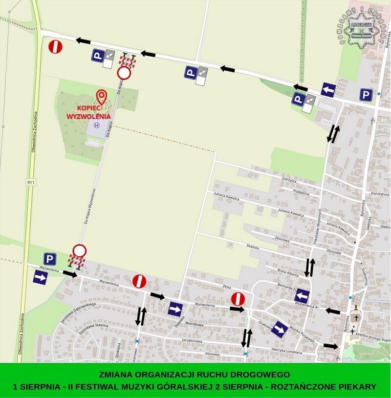 W związku z organizacją Festiwalu Muzyki Góralskiej, który odbędzie się na terenie Kopca Wyzwolenia w dniach 1-2 sierpnia, wprowadzone zostaną zmiany w organizacji ruchu drogowego w rejonie wydarzenia.