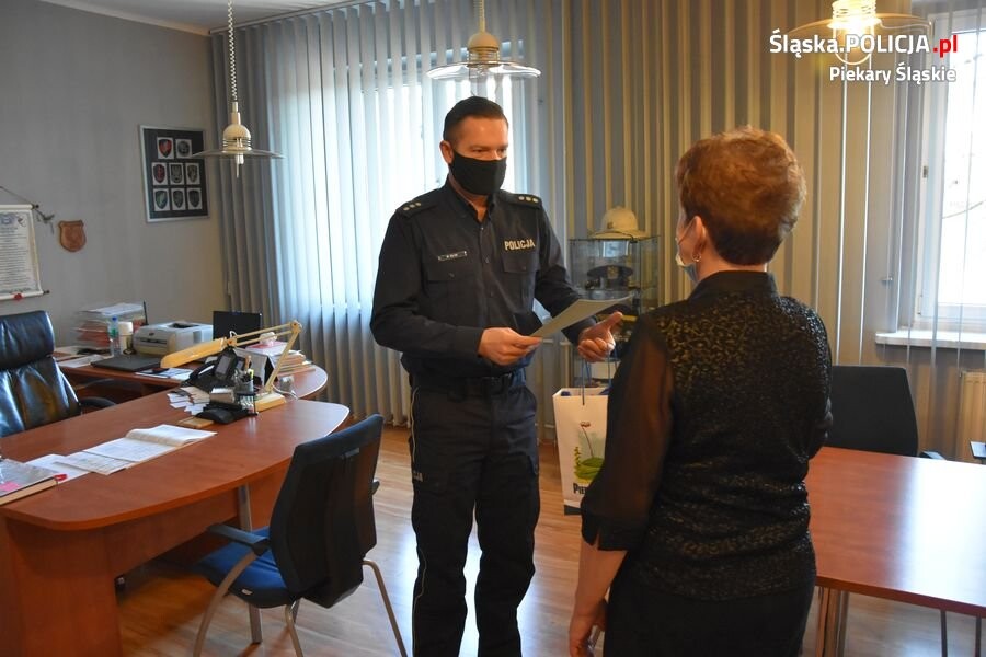 Na początku marca do dyżurnego Komendy Miejskiej Policji w Piekarach Śląskich zgłosiły się dwie osoby, które znalazły cudze portfele. Pierwszy, w którym znajdowało się blisko 300 zł. oraz dokumenty znalazła na drodze mieszkanka Piekar. Drugi portfel znalazł mieszkaniec Bytomia, który podczas tankowania pojazdu na stacji paliw przy ul. Bytomskiej zauważył leżący przy dystrybutorze portfel, w którym znajdowały się karty bankomatowe, dokumenty oraz 600 złotych. I Zastępca Komendanta Miejskiego Policji w Piekarach Śląskich kom. Mateusz Gilge wręczył list gratulacyjny oraz drobny upominek gratulując wzorowej obywatelskiej postawy, która zasługuje na pełne uznanie i wyróżnienie.