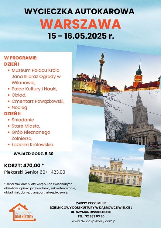 Już wkrótce mieszkańcy Piekar Śląskich będą mieli okazję wziąć udział w wycieczce autokarowej do Warszawy! Wyjazd odbędzie się w dniach 15-16 maja, a program wyprawy obejmuje wiele atrakcji turystycznych w stolicy.