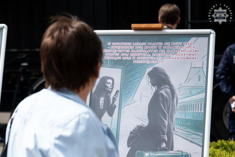 Na miejscu działały również policyjne stoiska profilaktyczne, przy których funkcjonariusze – w tym asp. Aleksandra Zydyk i st. asp. Szymon Czysz – prowadzili rozmowy z młodzieżą i mieszkańcami na temat zagrożeń związanych z handlem ludźmi. Uczestnicy otrzymali broszury informacyjne oraz praktyczne wskazówki, jak rozpoznać symptomy przestępczego procederu i jak się przed nim chronić.