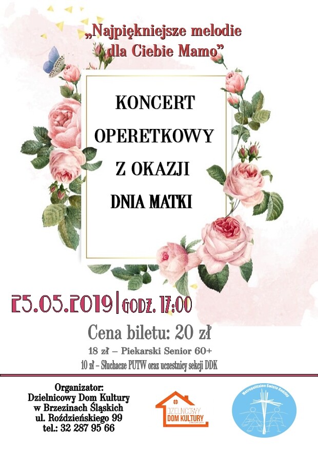 Z kolei w sobotę, 25 maja, o godzinie 17.00 w Dzielnicowym Domu Kultury w Brzezinach Śląskich będzie miał miejsce koncert „Dla Ciebie, Mamo”. W repertuarze znajdą się najpiękniejsze arie i operetki w wykonaniu artystów śląskiej sceny muzycznej. Wydarzenie to jest biletowane, a ilość miejsc ograniczona. Szczegóły oraz dodatkowe informacje udzielane są w placówce DDK oraz pod numerem telefonu: 32 287 95 66.