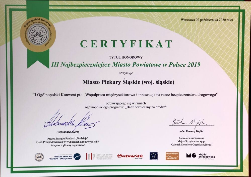 Piekary Śląskie mogą poszczycić się tytułem "Najbezpieczniejsze Miasto w Polsce 2019". Zostało docenione za dobre statystyki dotyczące bezpieczeństwa na drogach.