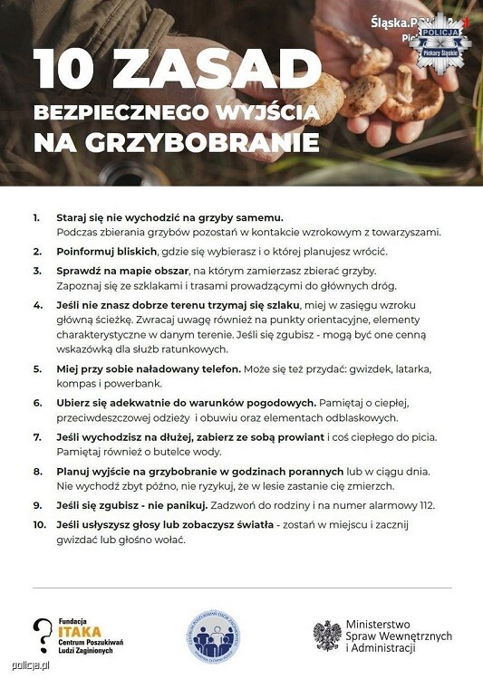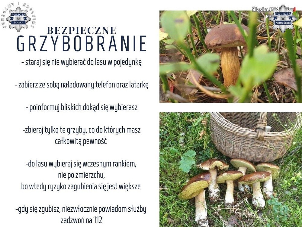 Policja zdecydowanie odradza wybieranie się na grzybobranie w pojedynkę. Jeżeli nie mamy innej możliwości, zawsze powinniśmy poinformować bliskich, gdzie się znajdujemy, i podać przybliżony czas powrotu. Warto także pamiętać o zachowaniu kontaktu wzrokowego z osobami, z którymi się poruszamy po lesie.