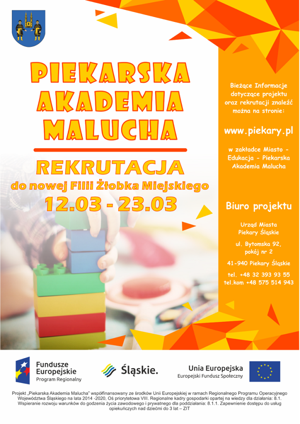 Rodzice, którzy deklarują chęć skorzystania z usług opiekuńczych w żłobku, muszą dostarczyć Formularz Rekrutacyjny wraz z niezbędnymi załącznikami do Biura Projektu, które mieści się w Wydziale Polityki Gospodarczej UM Piekary Śląskie – ul. Bytomska 92, pokój nr 2. Nieprzekraczalny termin złożenia dokumentów to 12 – 23 marca.