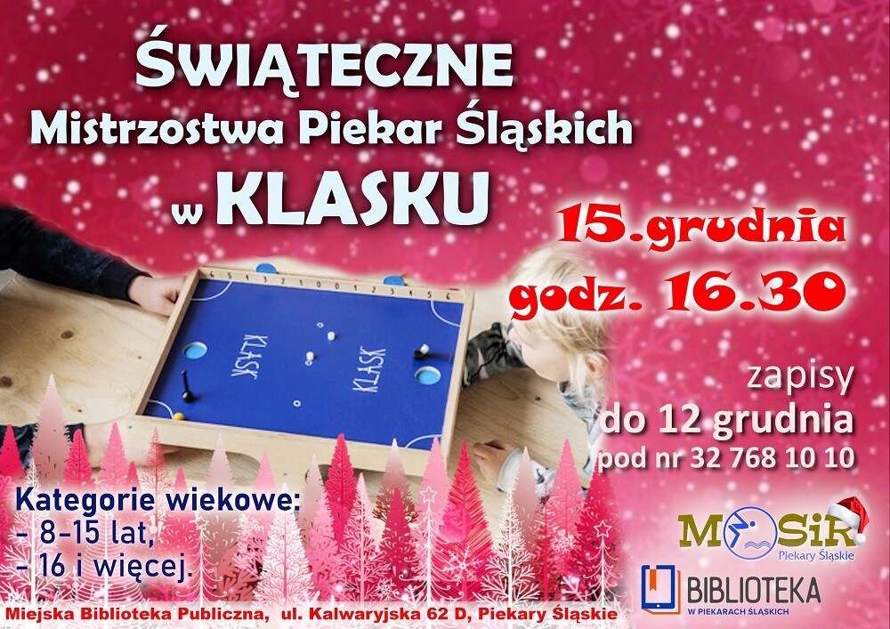 W poniedziałek, 15 grudnia, w Miejskiej Bibliotece Publicznej im. Teodora Heneczka w Piekarach Śląskich odbędą się Świąteczne Mistrzostwa Piekar Śląskich w Klasku. Zawody to doskonała okazja, by wziąć udział w rywalizacji zręcznościowej grze planszowej, która łączy cechy cymbergaja i piłkarzyków.