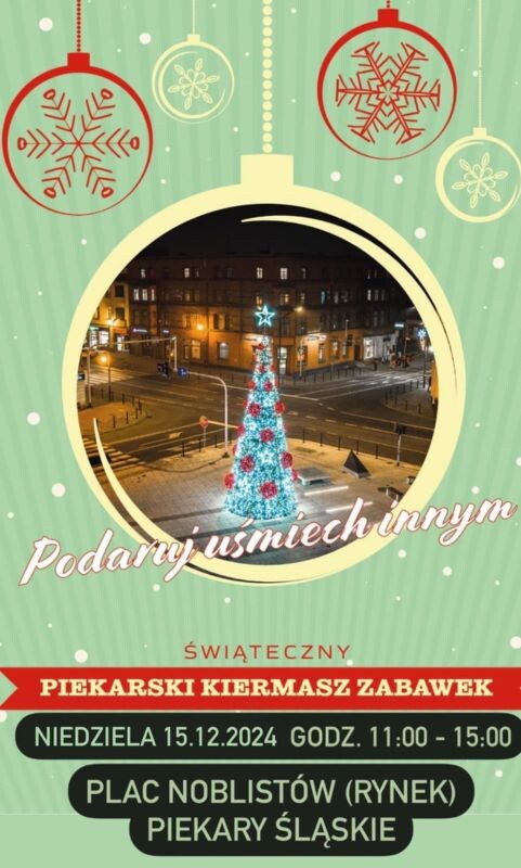 W niedzielę 15 grudnia w godzinach 11.00 – 15.00 w Piekarach Śląskich na Placu Noblistów Śląskich odbędzie się IV Świąteczny Piekarski Kiermasz Zabawek. Zabawki będą rozdawana za darmo! Organizatorami imprezy jest SPI Społeczna Piekarska Inicjatywa i przyjaciele.