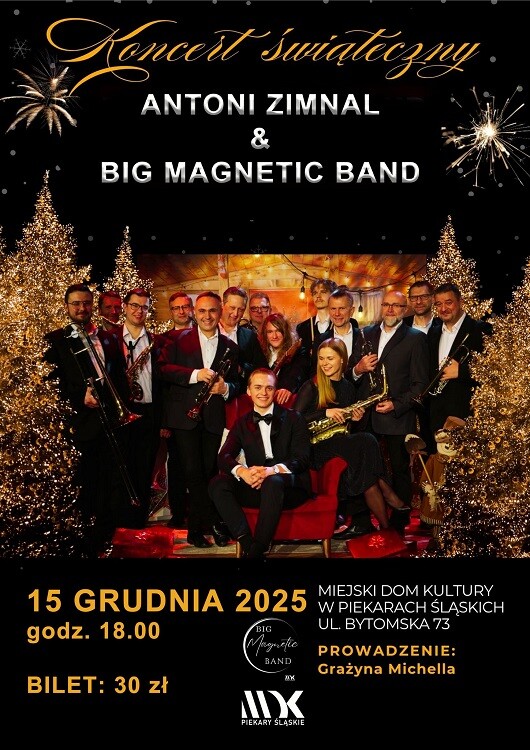 Miejski Dom Kultury w Piekarach Śląskich zaprasza mieszkańców na wyjątkowe wydarzenie pełne muzyki, emocji i świątecznego klimatu. Już 15 grudnia o godzinie 18:00 odbędzie się Koncert Świąteczny w wykonaniu Antoniego Zimnala oraz Big Magnetic Band – 14-osobowego zespołu znanego z energii, harmonii i perfekcyjnych aranżacji.