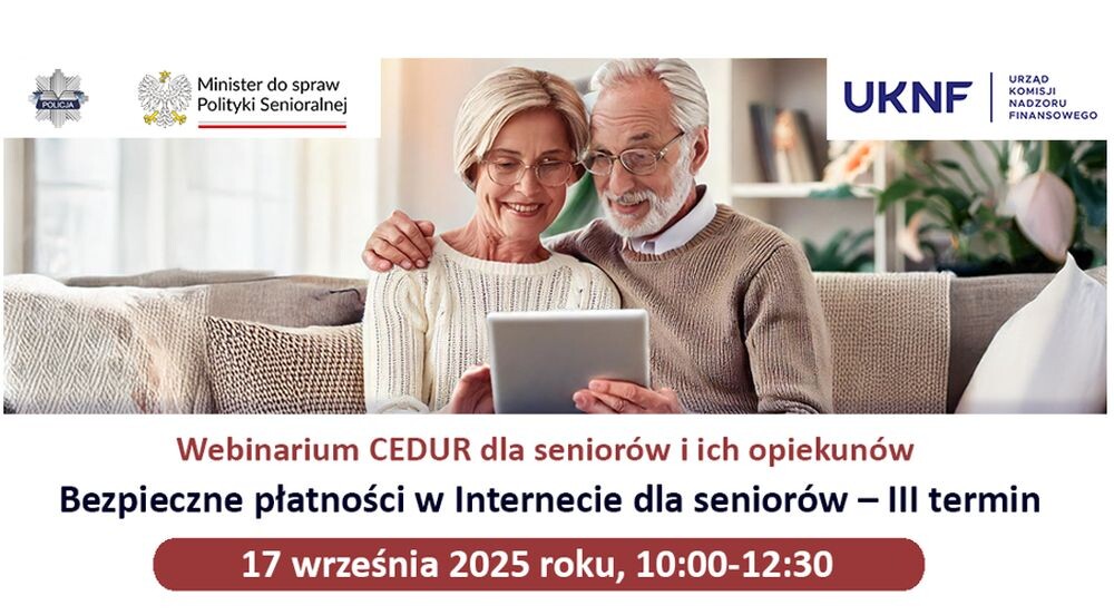Urząd Komisji Nadzoru Finansowego zaprasza seniorów i ich opiekunów na webinarium „Bezpieczne płatności w Internecie dla seniorów – III termin”. Spotkanie online odbędzie się 17 września w godz. 10:00–12:30.