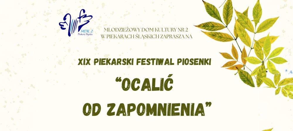 Młodzieżowy Dom Kultury nr 2 w Piekarach Śląskich zaprasza do wzięcia udziału w XIX Piekarskim Festiwalu Piosenki “Ocalić od zapomnienia”. Celem konkursu jest popularyzacja twórczości polskich artystów, którzy odeszli, pozostawiając w naszej pamięci niezapomniane przeboje. Konkurs przeznaczony jest wyłącznie dla solistów z podziałem na kategorie wiekowe: począwszy od uczniów szkół podstawowych z klas IV do osób dorosłych.
